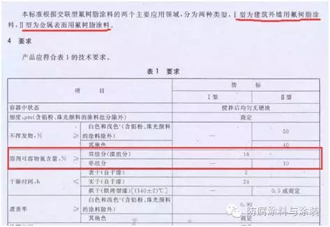 在氟化工行業(yè)標(biāo)準(zhǔn)HG/T3792—2005交聯(lián)型氟樹脂涂料中,規(guī)定的雙組份氟碳涂料的溶劑可溶物氟含量≥18%。(如下圖)